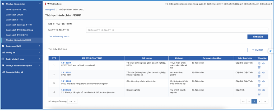 Tại đây, người dùng có thể thực hiện tìm kiếm thủ tục hành chính liên quan đến hoạt động sản xuất, kinh doanh (TTHC SXKD) theo nhiều tiêu chí tìm kiếm khác nhau: