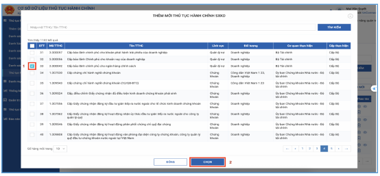 để thực hiện thêm mới TTHC SXKD (Lựa chọn từ danh mục TTHC). Người dùng có thể nhập mã TTHC/Tên TTHC để tìm kiếm TTHC. Sau khi tìm kiếm thủ tục hành chính, người dùng lựa chọn thủ tục hành chính và nhấn “Chọn” để TTHC hiển thị lên màn hình danh sách TTHC SXKD