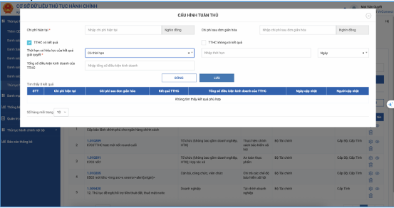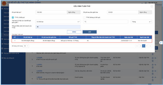 Bước 3: Thực hiện cập nhật chi phí tuân thủ TTHC, điều kiện kinh doanh tại “cấu hình tuân thủ” bằng cách nhấn nút