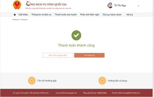 Thanh toán thành công, hiển thị màn hình thông báo thành công, người dùng có thể xem và tải biên lai trên Cổng DVCQG trong Thông tin tài khoản.