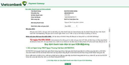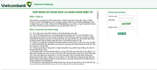 Ví dụ người dùng chọn thanh toán qua Ngân hàng Vietcombank (VCB), hệ thống điều hướng sang trang Ibanking của VCB như sau: