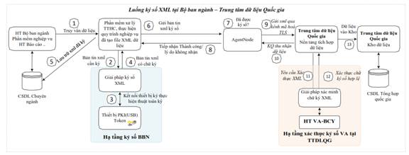 Bước 3: Cơ quan CQDL thực hiện chuyển đổi dữ liệu trong CSDL Trung gian thành các file XML và thực hiện ký số bằng công cụ ký số (đã được cài đặt ở Bước 1). Các tệp XML đã được ký số sau đó được lưu trữ trong một khu vực xác định trước trên Máy chủ lưu trữ file dữ liệu đã ký số.