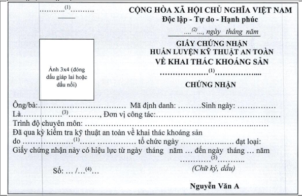 - Thông tư số 43/2025/TT-BCT ngày 04 tháng 7 năm 2025 của Bộ trưởng Bộ Công Thương quy định về kỹ thuật an toàn trong khai thác khoáng sản.Mẫu số 01