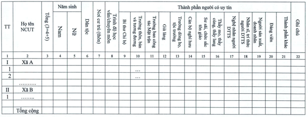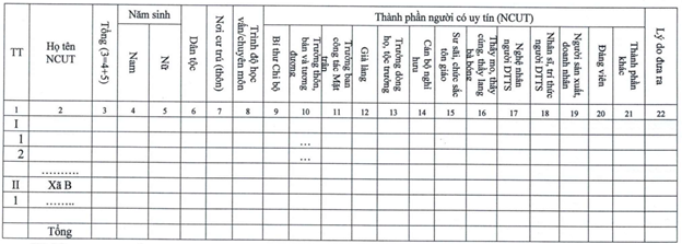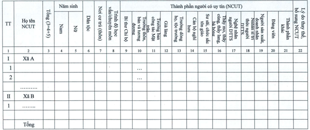 | Ghi chú: | - Cột (6): Ghi cụ thể dân tộc của người có uy tín (NCUT). - Cột (7): Ghi cụ thể thôn, bản, tổ dân phố.... Nơi NCUT đang sinh sống, cư trú. - Cột (8): Ghi cụ thể trình độ học vấn (Tiểu học, THCS, THPT)/trình độ chuyên môn (Trung cấp, Cao đẳng, đại học...). - Từ Cột (9) đến (21): Ghi cụ thể thành phần của NCUT, ví dụ: Già làng, Trưởng thôn, Trưởng ban công tác mặt trận thôn, Bí thư Chi bộ... - Cột (22); Ghi cụ thể lý do NCUT được thay thế, bổ sung. |