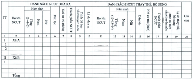 | Ghi chú: | - Cột (6), (15): Ghi cụ thể dân tộc của người có uy tín (NCUT). - Cột (7), (16): Ghi cụ thể thôn, bản, tổ dân phố.... Nơi NCUT đang sinh sống, cư trú. - Cột (8), (17): Ghi cụ thể thành phần của NCUT, ví dụ: Già làng, Trưởng thôn, Trưởng ban công tác mặt trận thôn, Bí thư Chi bộ.... - Cột (9), ((18): Ghi cụ thể trình độ học vấn (Tiểu học, THCS, THPT)/trình độ chuyên môn (Trung cấp, Cao đẳng, đại học...). - Cột (10), (19): Ghi cụ thể lý do đưa NCUT ra khỏi danh sách/ lý do NCUT được thay thế, bổ sung. |