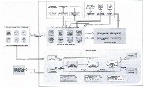 - Tích hợp và điều phối dữ liệu: Sử dụng Nền tảng Tích hợp, chia sẻ (LGSP/NDXP) hoạt động như một trục tích hợp trung tâm (API gateway, ESB, Data Orchestration) để quản lý luồng dữ liệu giữa các hệ thống. Dữ liệu được thu thập và điều phối nhịp nhàng để nạp vào lớp nền tảng dữ liệu trung tâm.
