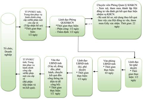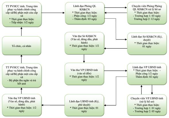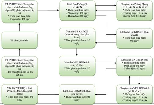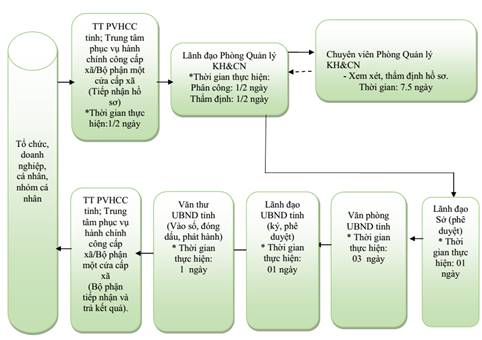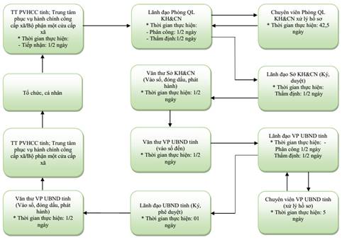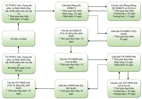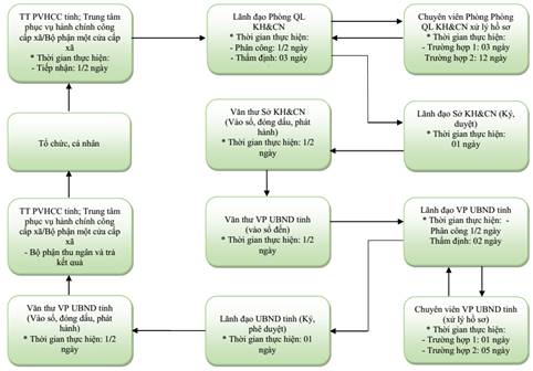 | 1 | Thủ tục công nhận trung tâm đổi mới sáng tạo cấp tỉnh * Thời gian thực hiện: - Trường hợp 1: Trong thời hạn 15 ngày kể từ ngày nhận được hồ sơ hợp lệ. - Trường hợp 2: Trong trường hợp cần thiết, cơ quan có thẩm quyền công nhận thành lập Hội đồng tư vấn công nhận, trong thời hạn: 27 ngày + Trong thời hạn 05 ngày làm việc kể từ ngày họp hội đồng, cơ quan có thẩm quyền công nhận yêu cầu giải trình, hoàn thiện hồ sơ. + Trong thời hạn 07 ngày làm việc kể từ ngày họp Hội đồng tư vấn công nhận hoặc kể từ ngày nhận được hồ sơ hoàn thiện sau khi giải trình, cơ quan có thẩm quyền công nhận ban hành quyết định công nhận và cấp Giấy công nhận hoặc không công nhận. |