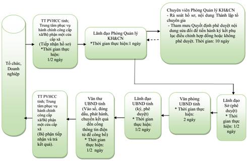 | 14 | Thủ tục sửa đổi, chấm dứt Hợp đồng tài trợ thực hiện nhiệm vụ đổi mới sáng tạo - Thời gian thực hiện: a. Đối với trường hợp sửa đổi hợp đồng:15 ngày kể từ ngày nhận ý kiến của chuyên gia, các bên liên quan (nếu có) b. Đối với trường hợp chấm dứt thực hiện nhiệm vụ:15 ngày kể từ ngày nhận ý kiến của các bên liên quan (nếu có) | a. Đối với trường hợp sửa đổi hợp đồng:15 ngày kể từ ngày nhận ý kiến của chuyên gia, các bên liên quan (nếu có)