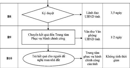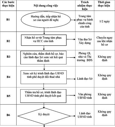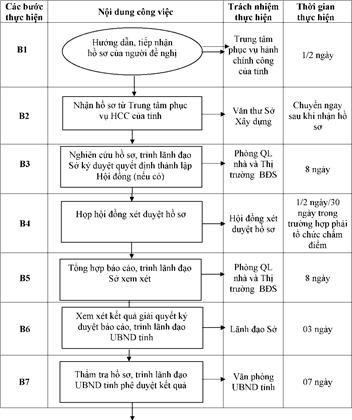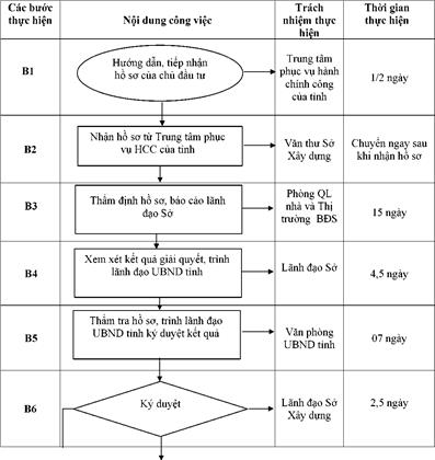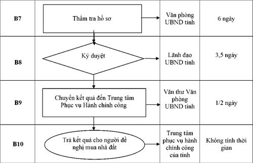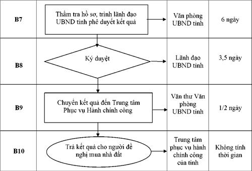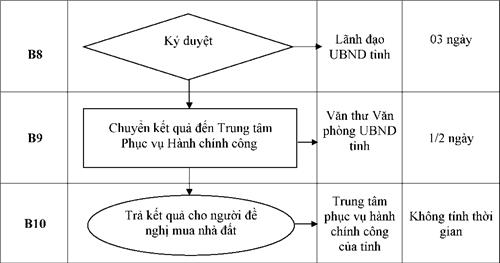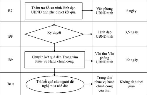 - Lãnh đạo Sở xem xét kết quả giải quyết của phòng Quản lý nhà và thị trường bất động sản xem xét kết quả giải quyết thời hạn 4,5 ngày làm việc ký trình UBND tỉnh
