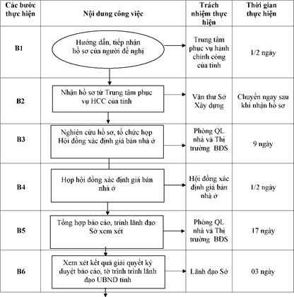 - Trưởng phòng Quản lý nhà và thị trường bất động sản giao chuyên viên thụ lý, nghiên cứu thẩm định hồ sơ và tham mưu trình lãnh đạo Sở ký giấy mời họp Hội đồng xác định giá bán nhà ở trong thời gian 14 ngày làm việc.