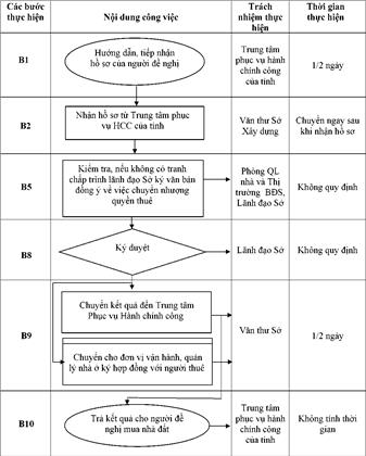 - Trưởng phòng Quản lý nhà và thị trường bất động sản giao chuyên viên thụ lý, kiểm tra, nếu nhà ở không có tranh chấp, khiếu kiện báo cáo Trưởng phòng trình lãnh đạo Sở ký văn bản đồng ý về việc chuyển nhượng quyền thuê