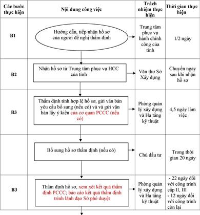 - Công chức của Sở Xây dựng trực tại Trung tâm Phục vụ hành chính công thực hiện kiểm tra thành phần hồ sơ, số lượng hồ sơ. Nếu đầy đủ theo quy định thì tiếp nhận gửi giấy hẹn/mã hồ sơ cho chủ đầu tư và bàn giao hồ sơ cho Văn phòng Sở Xây dựng trong thời gian 1/2 ngày làm việc kể từ khi tiếp nhận hồ sơ. Nếu hồ sơ chưa đầy đủ thì lập phiếu hướng dẫn chủ đầu tư hoàn thiện hồ sơ.