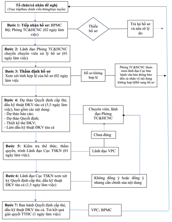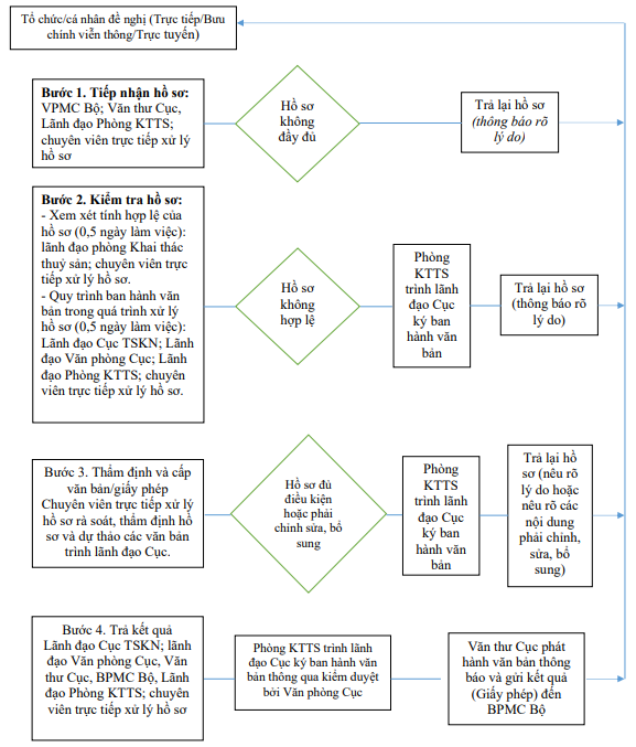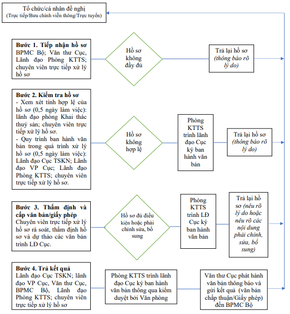 a) Đơn vị/cá nhân chịu trách nhiệm: BPMC Bộ; Văn thư Cục, Lãnh đạo Phòng Khai thác thuỷ sản; chuyên viên trực tiếp xử lý hồ sơ.