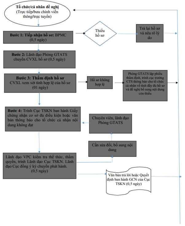 - Hồ sơ đáp ứng quy định, Chuyên viên dự thảo, Lãnh đạo Phòng GTATS trình, Lãnh đạo VP Cục rà soát về thể thức, Lãnh đạo Cục TSKN ký ban hành Quyết định thành lập đoàn kiềm tra điều kiện tại cơ sở;