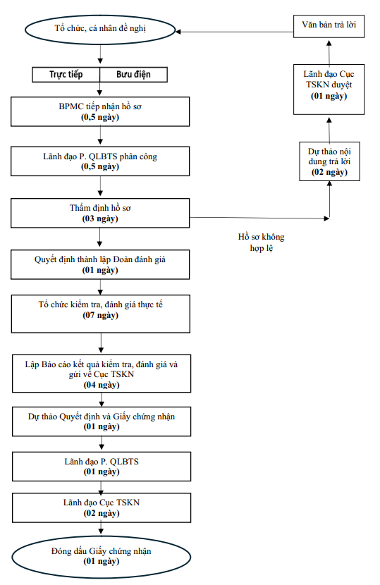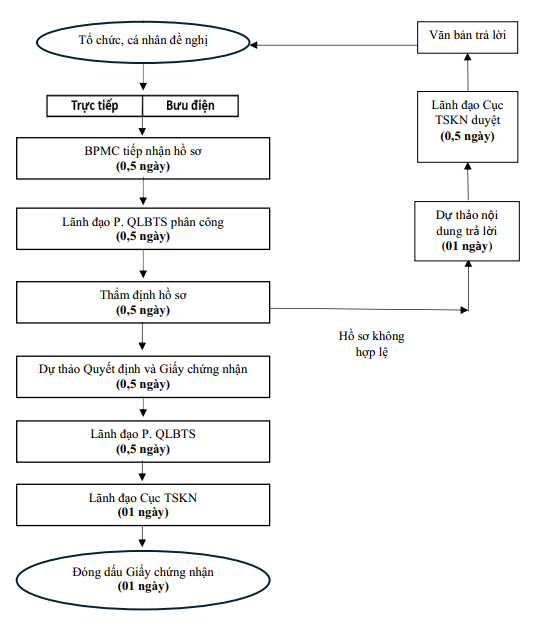 - BPMC tiếp nhận hồ sơ trực tiếp của tổ chức đề nghị hoặc tiếp nhận qua đường bưu điện, quét (scan) đơn để lưu trữ hồ sơ điện tử, chuyển hồ sơ cho P. QLBTS xem xét, thẩm định, xử lý hồ sơ;