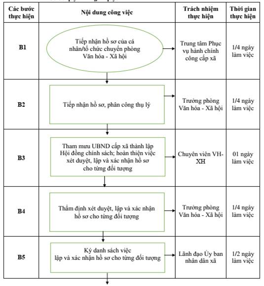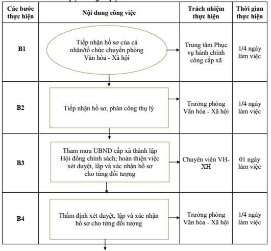 + Nếu hồ sơ đủ điều kiện, chuyên viên tham mưu Ủy ban nhân dân cấp xã thành lập Hội đồng chính sách; hoàn thiện việc xét duyệt, lập và xác nhận hồ sơ cho từng đối tượng trình Lãnh đạo Phòng Văn hóa - Xã hội cấp xã xem xét, phê duyệt kết quả thẩm định: Thời gian thực hiện tối đa 01 ngày làm việc kể từ khi tiếp nhận hồ sơ.