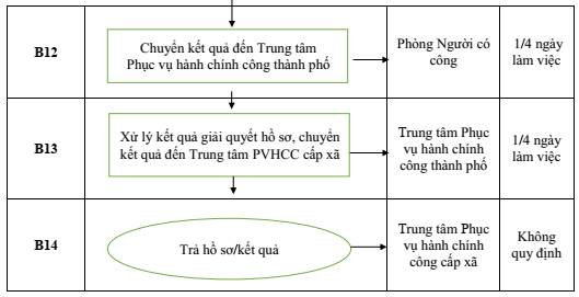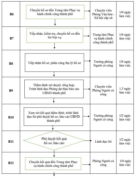 - Lãnh đạo Sở xem xét ký duyệt kết quả thẩm định của Phòng Người có công, báo cáo Ủy ban nhân dân thành phố: Thời gian thực hiện 1/2 ngày làm việc.