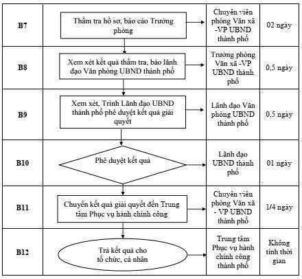 - Phòng Văn xã - Văn phòng Ủy ban nhân thành phố thực hiện thẩm tra hồ sơ, báo cáo lãnh đạo Văn phòng UBND thành phố xem xét, trình Ủy ban nhân dân thành phố phê duyệt kết quả.