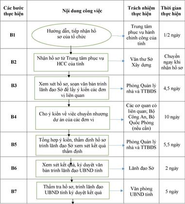 - Phòng Quản lý nhà và Thị trường bất động sản xem xét, thẩm định hồ sơ và tham mưu trình lãnh đạo Sở ký văn bản xin ý kiến các đơn vị có liên quan trong thời gian 4,5 ngày làm việc.