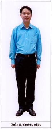 b) Quần: Kiểu quần âu dài, cửa quần kéo phéc-mơ-tuya. Thân trước có hai túi chéo, thân sau có túi cơi cài cúc. Cạp quần gắn dây để luồn dây lưng.