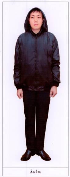 1. Kiểu mẫu: Áo kiểu mở ngực kéo phéc-mơ-tuya, nẹp áo đóng cúc bấm; mũ áo rời cài vào thân áo bằng cúc bấm; phía dưới thân trước có hai túi ốp nối; tay áo dài, cửa tay có chun. Quần suông, cạp chun, gấu quần gắn cúc bấm.