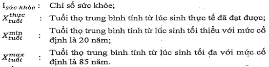 Isức khỏe: Chỉ số sức khỏe, được tính thông qua chỉ tiêu tuổi thọ trung bình tính từ lúc sinh; còn được gọi là tuổi thọ bình quân hay triển vọng sống trung bình khi sinh;