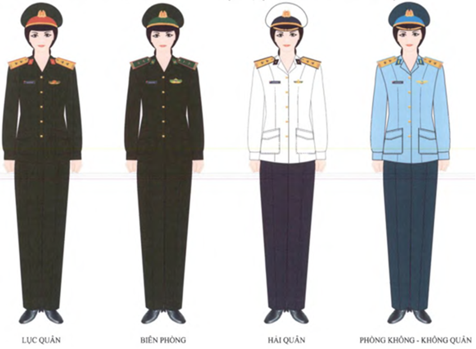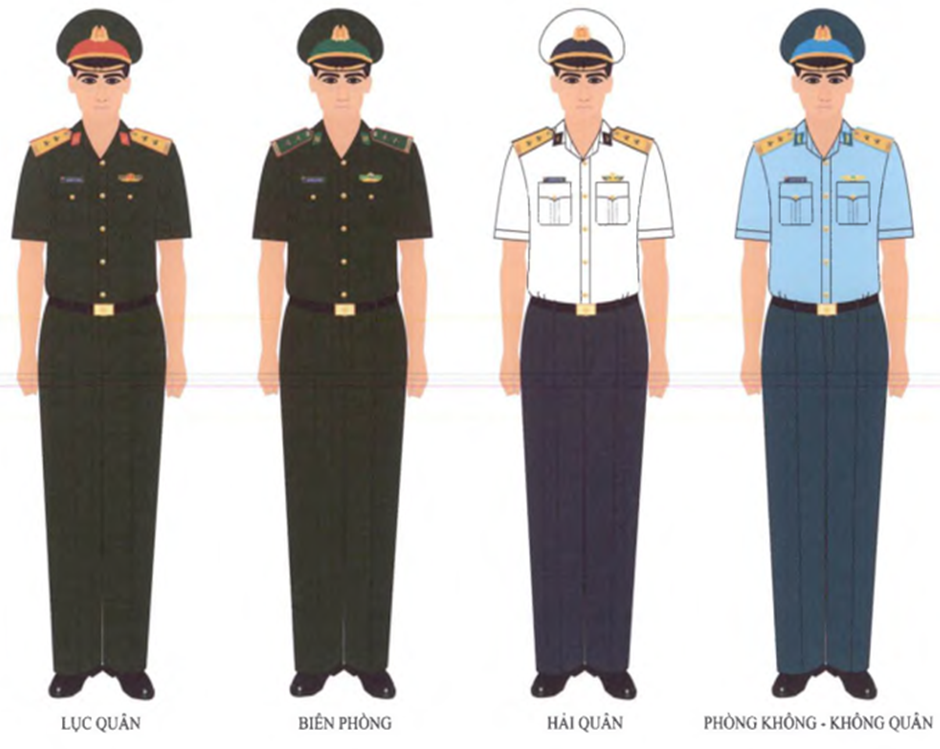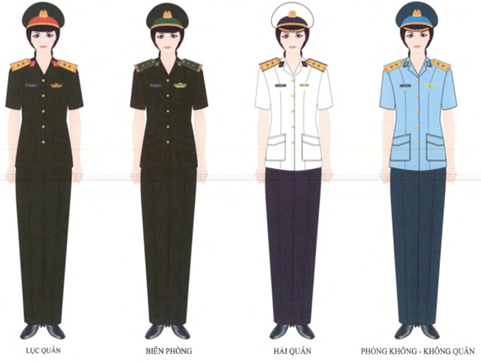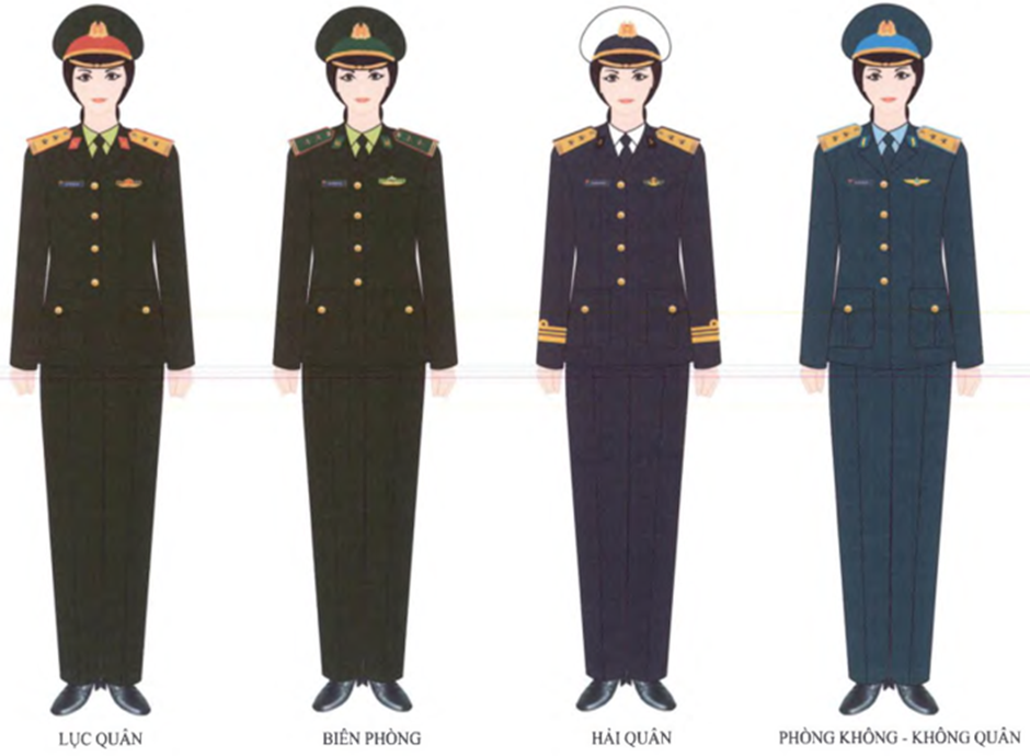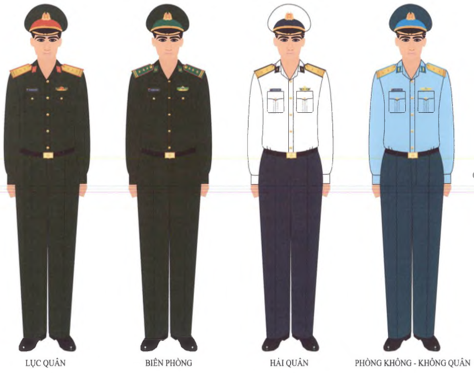 Màu sắc trang phục cũng thay đổi theo lực lượng: Lục quân và Bộ đội Biên phòng màu xanh lá cây, Phòng không - Không quân màu xanh đậm, Hải quân có áo màu trắng và quần màu tím than.