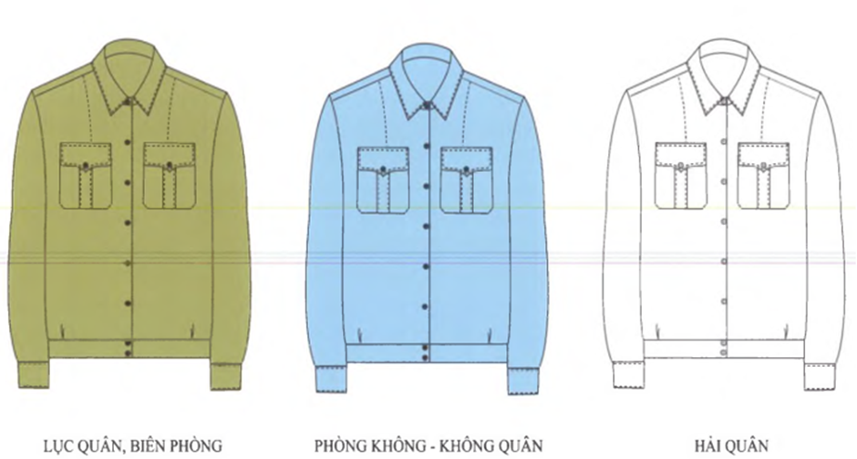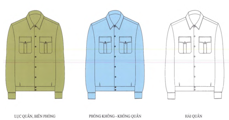 a) Nam: Kiểu áo sơ mi, cổ đứng. Mỗi bên đầu cổ áo thùa hai khuyết đeo phù hiệu. Thân trước có hai túi ngực ốp nổi, nắp túi cài cúc; nẹp áo cài năm cúc và một cúc chân cổ. Thân sau có cầu vai xếp hai ly. Vai áo có dây vai đeo cấp hiệu. Tay áo dài, có măng séc cài cúc.