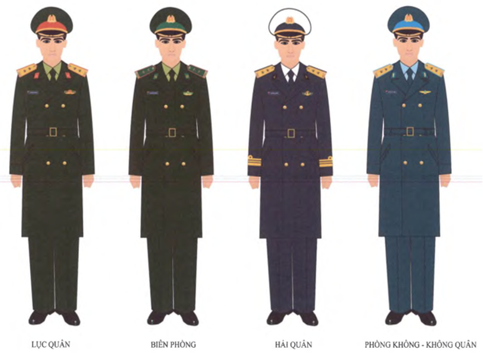 2. Màu sắc: Lục quân và Bộ đội Biên phòng màu olive sẫm; Phòng không - Không quân màu xanh đậm; Hải quân màu tím than.