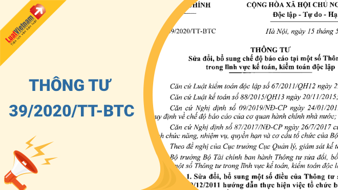 Ngày 15/5/2020, Bộ Tài chính ban hành Thông tư 39/2020/TT-BTC về việc sửa đổi, bổ sung chế độ báo cáo tại một số Thông tư trong lĩnh vực kế toán, kiểm toán độc lập.