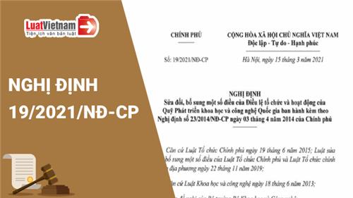 Ngày 15/3/2021, Chính phủ ban hành Nghị định 19/2021/NĐ-CP về việc sửa đổi, bổ sung một số điều của Điều lệ tổ chức và hoạt động của Quỹ Phát triển khoa học và công nghệ Quốc gia ban hành kèm theo Nghị định 23/2014/NĐ-CP ngày 03/4/2021 của Chính phủ.