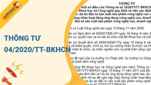 Ngày 28/09/2020, Bộ Khoa học và Công nghệ ban hành Thông tư 04/2020/TT-BKHCN về việc sửa đổi, bổ sung một số điều của Thông tư số 32/2011/TT-BKHCN ngày 15 tháng 11 năm 2011 của Bộ trưởng Bộ Khoa học và Công nghệ quy định về việc xác định tiêu chí dự án ứng dụng công nghệ cao, dự án đầu tư sản xuất sản phẩm công nghệ cao và thẩm định hồ sơ đề nghị cấp Giấy chứng nhận hoạt động ứng dụng công nghệ cao, doanh nghiệp thành lập mới từ dự án đầu tư sản xuất sản phẩm công nghệ cao, doanh nghiệp công nghệ cao.