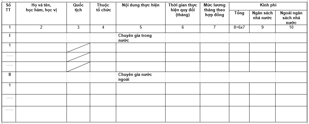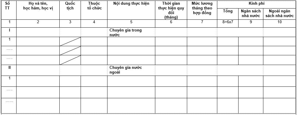 - Kinh phí ngân sách nhà nước khoán: ……………… triệu đồng (trong đó kinh phí thuê chuyên gia:……);