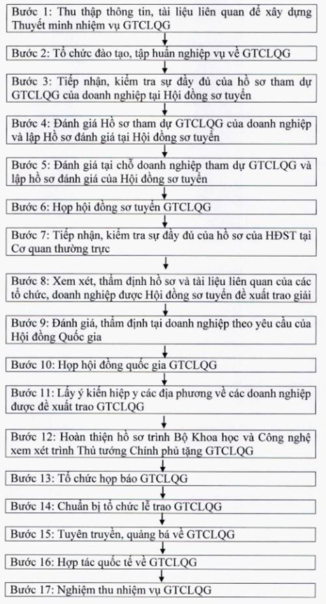 5. Nội dung dịch vụ sự nghiệp công sử dụng ngân sách nhà nước đối với hoạt động giải thưởng chất lượng quốc gia, gồm 17 bước công việc được quy định cụ thể tại Quy trình thực hiện dịch vụ hoạt động giải thưởng chất lượng quốc gia, trên cơ sở cụ thể hóa các quy định của pháp luật về giải thưởng chất lượng quốc gia.