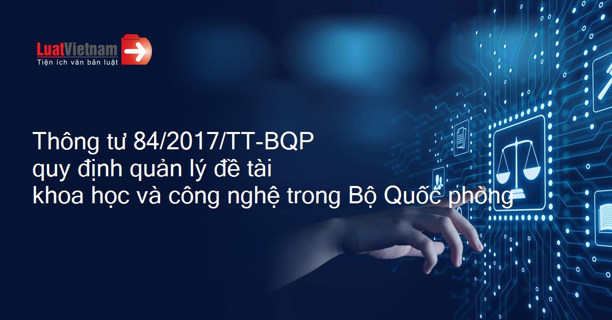 Ngày 10/4/2017, Bộ Quốc phòng ban hành Thông tư 84/2017/TT-BQP về quy định quản lý đề tài khoa học và công nghệ trong Bộ Quốc phòng.