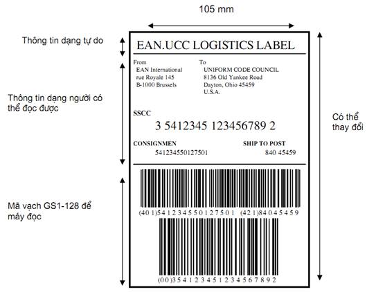 4.4.2. Khuyến nghị chiều rộng của nhãn tốt nhất là không đổi và bằng 105 mm. Chiều cao có thể thay đổi theo các yêu cầu liên quan đến dữ liệu. Ví dụ về nhãn đơn vị giao nhận GS1 trong thực tế xem Phụ lục A và B.
