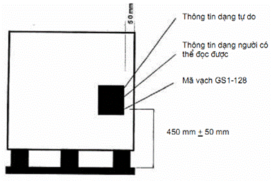 4.5.2. Nhãn phải được ghi (dán, gắn) tốt nhất là trên cả 4 mặt theo chiều cao của đơn vị hậu cần, nếu không phải đặt ít nhất trên hai mặt liền kề. Nhãn phải được đặt cách cạnh của đơn vị hậu cần ít nhất 50 mm và mã vạch GS1-128 đặt cách đáy 450 mm + 50 mm.