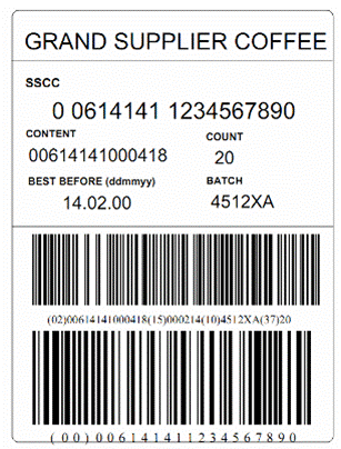 Dưới đây là một ví dụ về nhãn pallet được dán lên thùng hàng có dung lượng cố định. Thông tin được mã hóa thành mã vạch bao gồm mã côngtenơ vận chuyển theo xê-ri, mã số và số lượng đơn vị thương mại, hạn sử dụng và số chuyến.