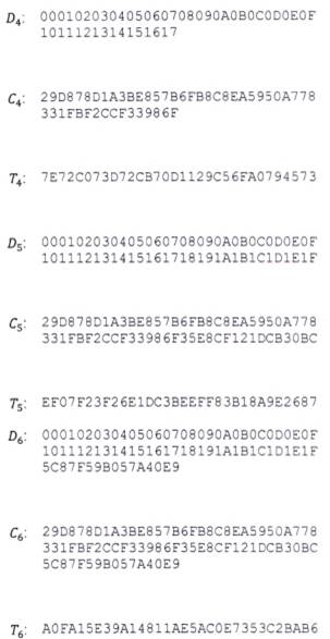 Sáu ví dụ về bộ ba: thông điệp (Di), bản mã (Ci) và tag (Ti) được tạo ra bằng cách sử dụng mã khối AES, trong môi trường hợp sử dụng t = 128. Tất cả các ví dụ dưới đều được biểu diễn theo hệ hexa. Khóa K và biến khởi tạo S được sử dụng trong 06 ví dụ: