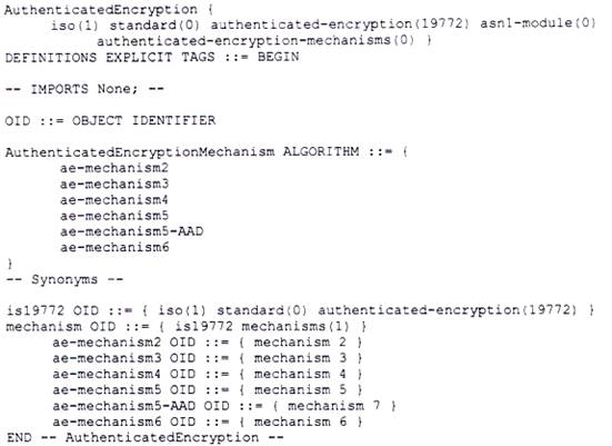 Mỗi một cơ chế xác thực được trình bày trong tiêu chuẩn này sử dụng thuật toán mã khối, trong trường hợp sử dụng cơ chế mã hóa có xác thực (cơ chế 5), sử dụng chế độ hoạt động tương tự và sử dụng thuật toán MAC. Do đó, mã nhận dạng đối tượng cơ chế mã hóa có xác thực có thể được tuân theo bởi một trong các mã nhận dạng thuật toán cơ chế mã hóa đối với mã khối được chỉ định trong TCVN 11367-3:2016 (ISO/IEC 18033-3:2010) và bất kỳ tham số liên quan nào. Đối với trường hợp cơ chế 5, nhận dạng các chế độ hoạt động của mã khối (TCVN 12213:2018 (ISO/IEC 10116:2017)) và thuật toán MAC [TCVN 11495 (ISO/IEC 9797) (Tất cả các phần)] có thể được cung cấp.