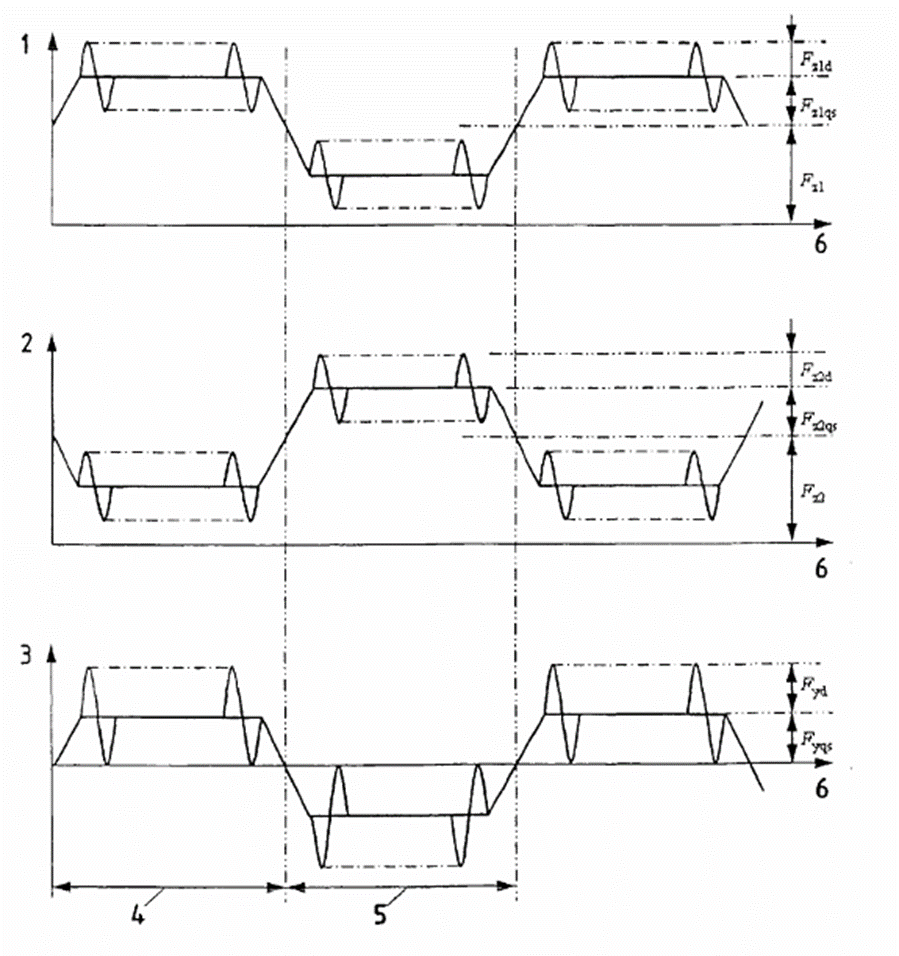 Các thành phần động của các lực thẳng đứng và lực ngang được áp dụng trong giai đoạn, ở cùng tần số theo cách cho phép mô phỏng tải trọng tác dụng lên khung giá chuyển hướng. Tương tự cũng áp dụng cho các thành phần bán tĩnh, ở tần số tương ứng với sự thay đổi về hướng cong. Hướng cong thường thay đổi luân phiên, mười đến hai mươi chu kỳ của các thành phần động. Nguyên tắc của các thử nghiệm này được minh họa trên hình G.2, cho thấy sự thay đổi theo thời gian của các lực khác nhau.