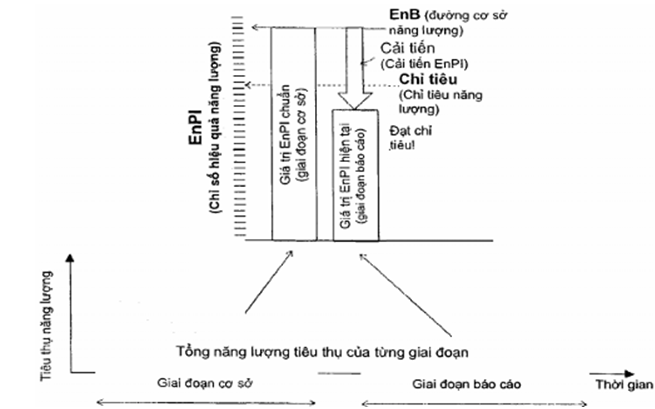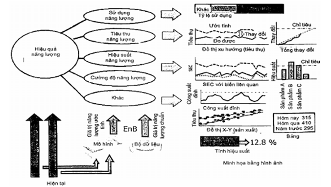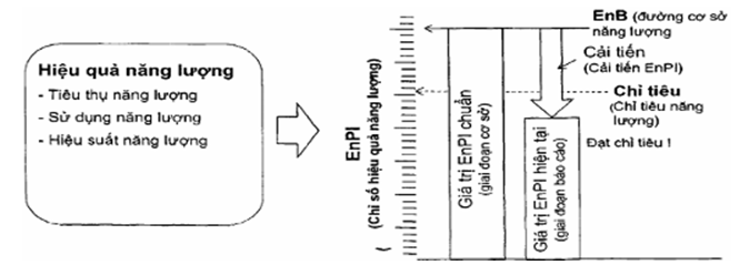 Hình 1 - Mối quan hệ giữa hiệu quả năng lượng, EnPI, EnB và chỉ tiêu năng lượng