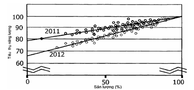 Sản lượng hằng ngày hoặc hằng tuần và tiêu thụ năng lượng tương ứng có thể được thể hiện trong biểu đồ X-Y, (Hình E5) sao cho mọi cải tiến hiệu quả năng lượng có thể được kiểm tra bằng mắt. Ví dụ, năm 2011, cơ sở sản xuất nhất định có thiết bị làm việc với 100 % công suất. Nhưng năm 2012, cơ sở sản xuất này được trang bị thêm và tiêu thụ năng lượng theo sản lượng. Việc này được phản ánh là sự giảm về tiêu thụ năng lượng theo tải nền trong biểu đồ X-Y.
