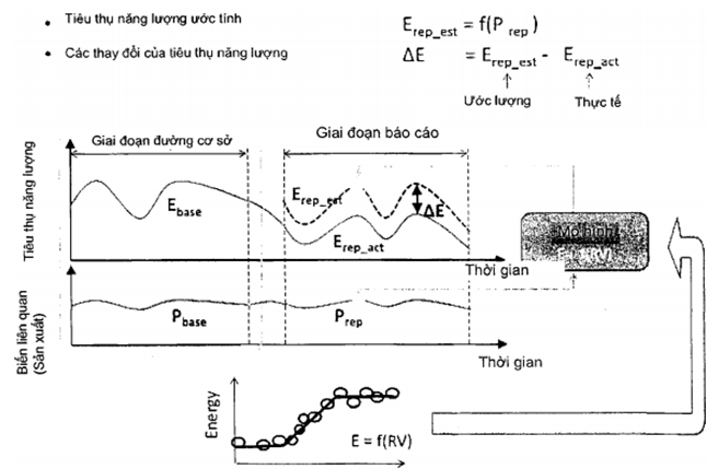 Mô hình tiêu thụ năng lượng này được xây dựng với việc sử dụng các giá trị về sản lượng trong suốt giai đoạn đường cơ sở. Mô hình trong trường hợp này chỉ sử dụng một biến liên quan - sản xuất. Mô hình này ước tính hoặc dự đoán về tiêu thụ năng lượng Erep_est, dựa trên các giá trị đối với biến liên quan trong suốt giai đoạn báo cáo. Sự chênh lệch về tiêu thụ năng lượng, ∆E, giữa tiêu thụ năng lượng thực, Erep_act, và tiêu thụ năng lượng ước tính là cải tiến hiệu quả năng lượng tính được.
