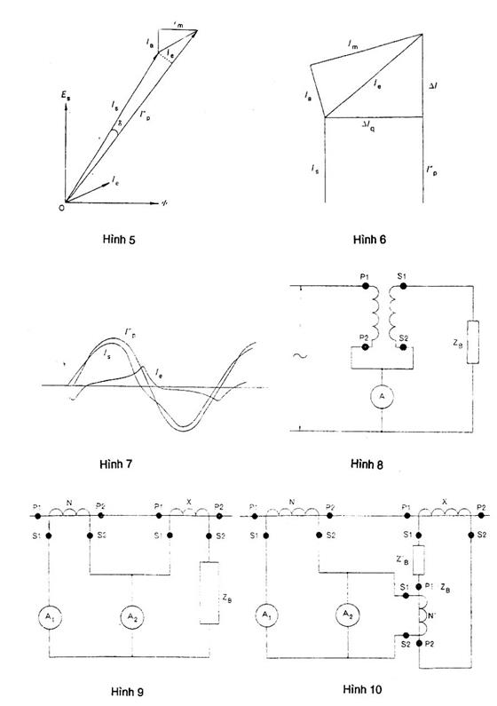 Trên hình 5, Is biểu thị dòng thứ cấp chạy qua một điện kháng của cuộn thứ cấp và tải này xác định bởi trị số và chiều của điện áp gây ra. Es và từ thông f từ thông này vuông góc với véctơ điện áp Es. Từ thông f được duy trì bởi dòng điện kích thích Ie. Dòng điện Ie gồm hai thành phần Im (thành phần từ) song song với từ thông và I0(thành phần tổn hao) song song với điện áp. Tổng véctơ của dòng điện thứ cấp Is và dòng điện kích thích Ie sẽ là véctơ I”p biểu thị cho dòng điện sơ cấp chia cho tỷ số biến dòng (tỷ số giữa số vòng dây của cuộn thứ cấp và số vòng dây của cuộn sơ cấp).