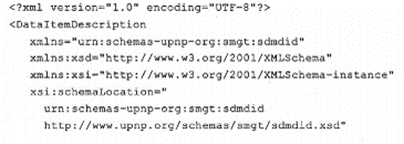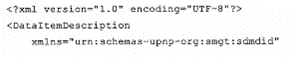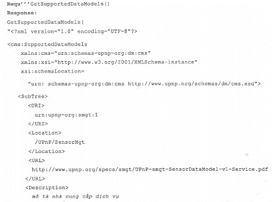 Sau khi tìm ra thiết bị IoTManagementAndControl thì điểm điều khiển sẽ kiểm tra mô hình dữ liệu được hỗ trợ. Hoạt động GetSupportedDatamodel() trả về tài liệu XML chứa các định nghĩa mô hình dữ liệu được hỗ trợ hiện hành. Mô hình dữ liệu hỗ trợ bởi thiết bị IoTManagementAndControl chứa URl:urn:upnp-org:smgt:1