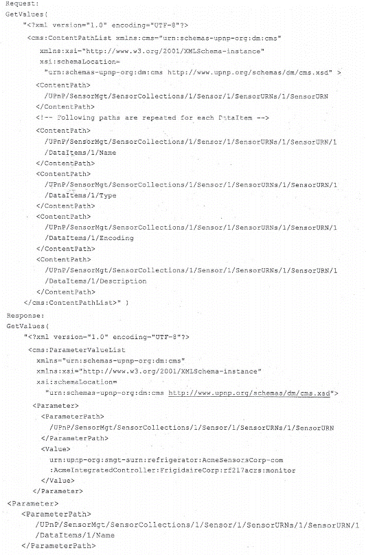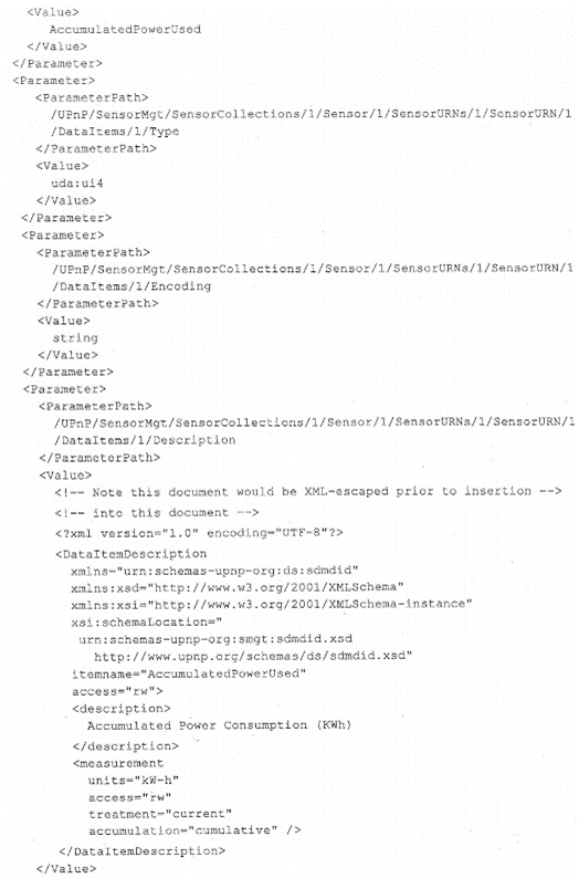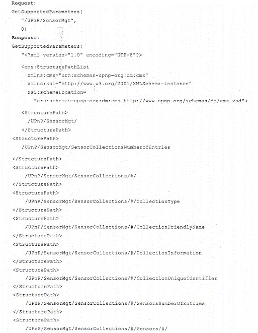 Tiếp theo điểm điều khiển sẽ gọi hoạt động GetSupportedParameter() sử dụng “/UPnP/SensorMgt” khi nút bắt đầu với SearchDepth đặt là (“0”), cho biết rằng điểm điều khiển muốn đọc toàn bộ cây con. Việc sử dụng thông tin này, điểm điều khiển có thể xác định các thông số được hỗ trợ, bao gồm các thông số cụ thể được phép hoặc hệ sinh thái.