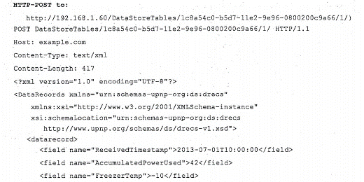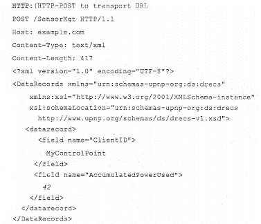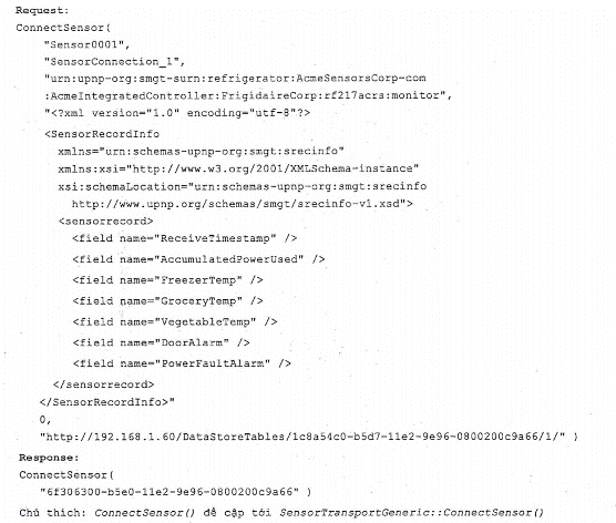 Để thiết lập kết nối HTTP nhằm biết được việc tiêu thụ năng lượng của tủ lạnh mô tả trong Phụ lục A, “Minh họa thiết bị mẫu”, hoạt động ConnectSensor() được gọi ra trong ví dụ sau đây. Hoạt động trả về đối số đầu ra TransportConnectionID. Tiếp sau đó, điểm điều khiển có thể nhận các DataItem trên URN cung cấp bởi đối số TransportURI.