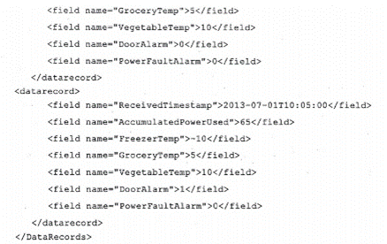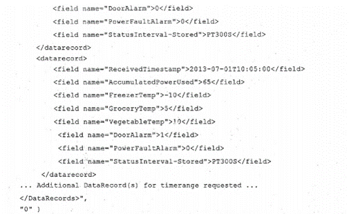 Trong ví dụ này, đối số SensorDataTypeEnable được đặt là (“0”) trong đó cho biết các DataRecord đã cung cấp không bao gồm các thuộc tính kiểu, mã hóa và vùng tên. Đối số ClientID đặt là “MyControlPoint” được sử dụng để đặt DataItem tương ứng giá trị của bộ cảm biến được chỉ thị. Khi sử dụng URL truyền tải đã cung cấp, bộ cảm biến sẽ cung cấp (các) DataRecord được chỉ ra dưới đây: