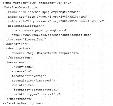 Để nhận được danh sách các thực thể tập hợp cảm biến thì điểm điều khiển sẽ gọi hoạt động GetInstances(“UPnP/SensorMgt/SensorCollections”,1).Đối số đầu tiên xác định nút bắt đầu, trong trường hợp này là SensorCollections, cài đặt đối số thứ hai, giới hạn độ sâu tìm kiếm đến 1. Do vậy, chỉ các thực thể của SensorCollection sẽ được trả về bởi lệnh gọi này. Tài liệu XML chứa một danh sách các thực thể tập hợp cảm biến. Trong ví dụ về tủ lạnh, chỉ một thực thể có mặt. Đầu ra XML tương ứng được chỉ ra dưới đây.